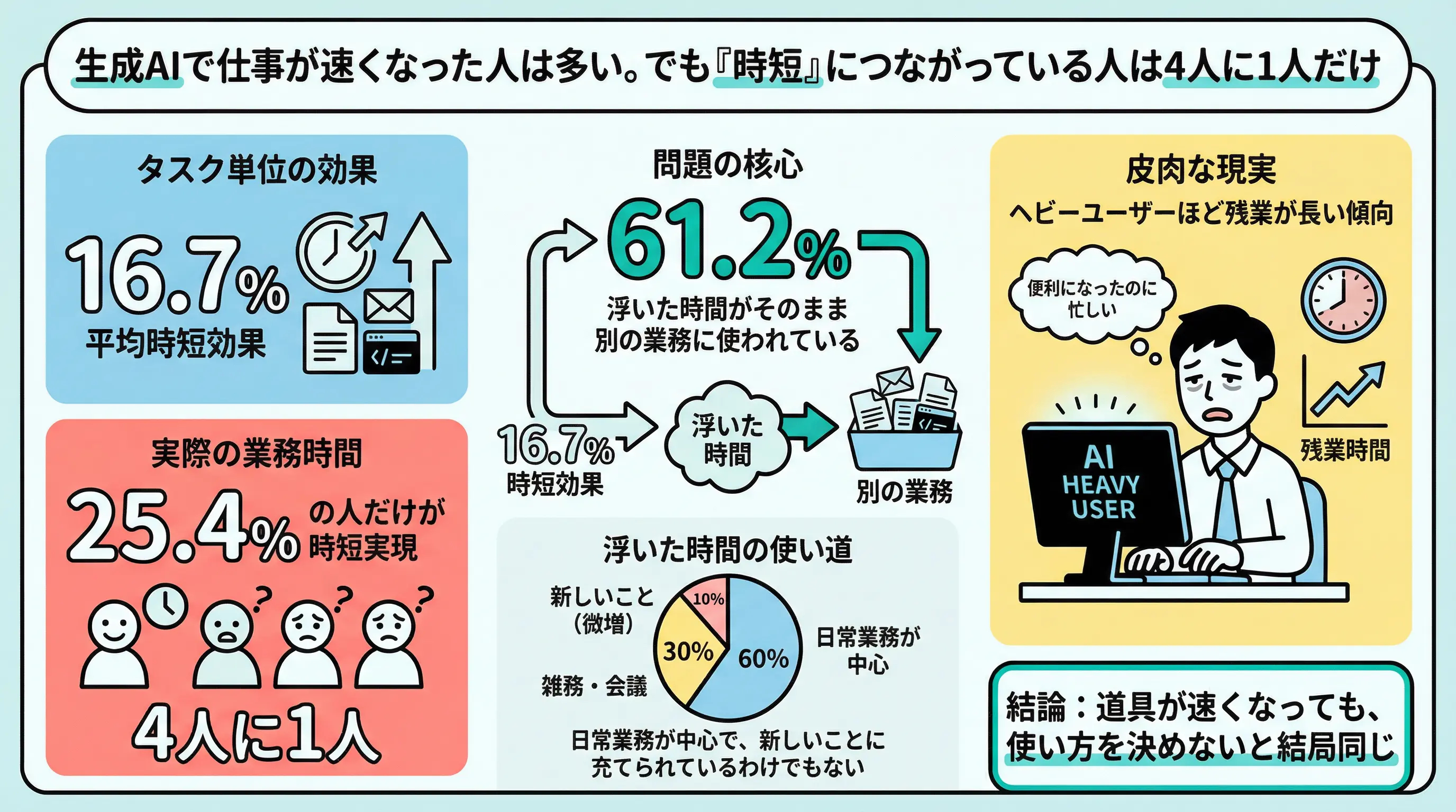パーソル総合研究所の調査で、生成AIを仕事に使っている人は全国で約1,840万人(32.4%)いるものの、実際に業務時間が減ったと感じている人は4人に1人(25.4%)にとどまることがわかりました。浮いた時間の6割以上が別の仕事に使われており、「速くなったけど楽にはなっていない」という実態が浮き彫りになっています。