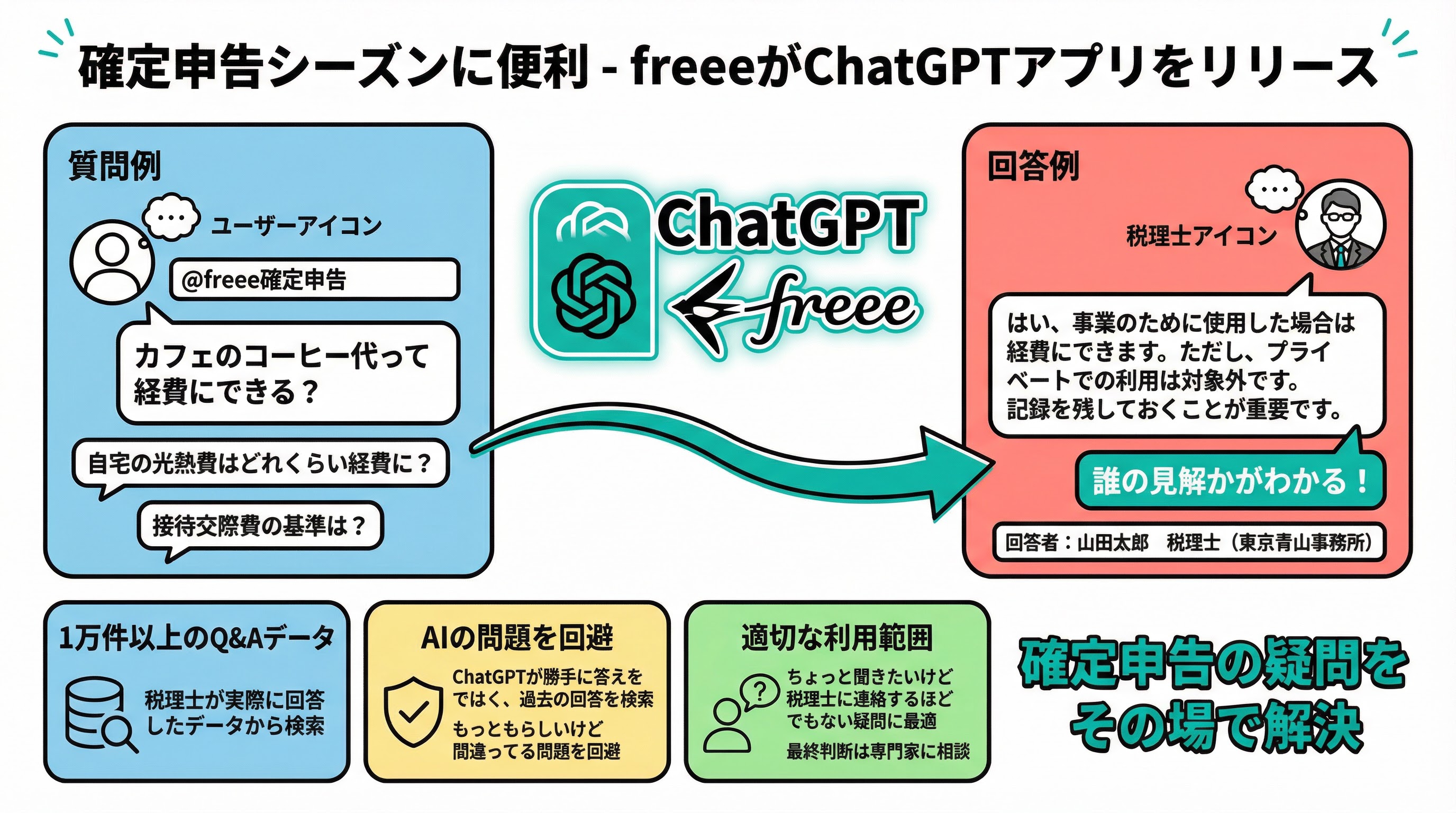 freee株式会社が2月17日、ChatGPTのネイティブアプリ「freee確定申告」を提供開始。ChatGPT上で税務の質問を入力すると、税理士が回答した1万件超のQ&Aデータから関連情報を検索・表示する。回答者の氏名・所属も明記され、AIが回答を生成するのではなく既存の専門家回答を引用する仕組み。