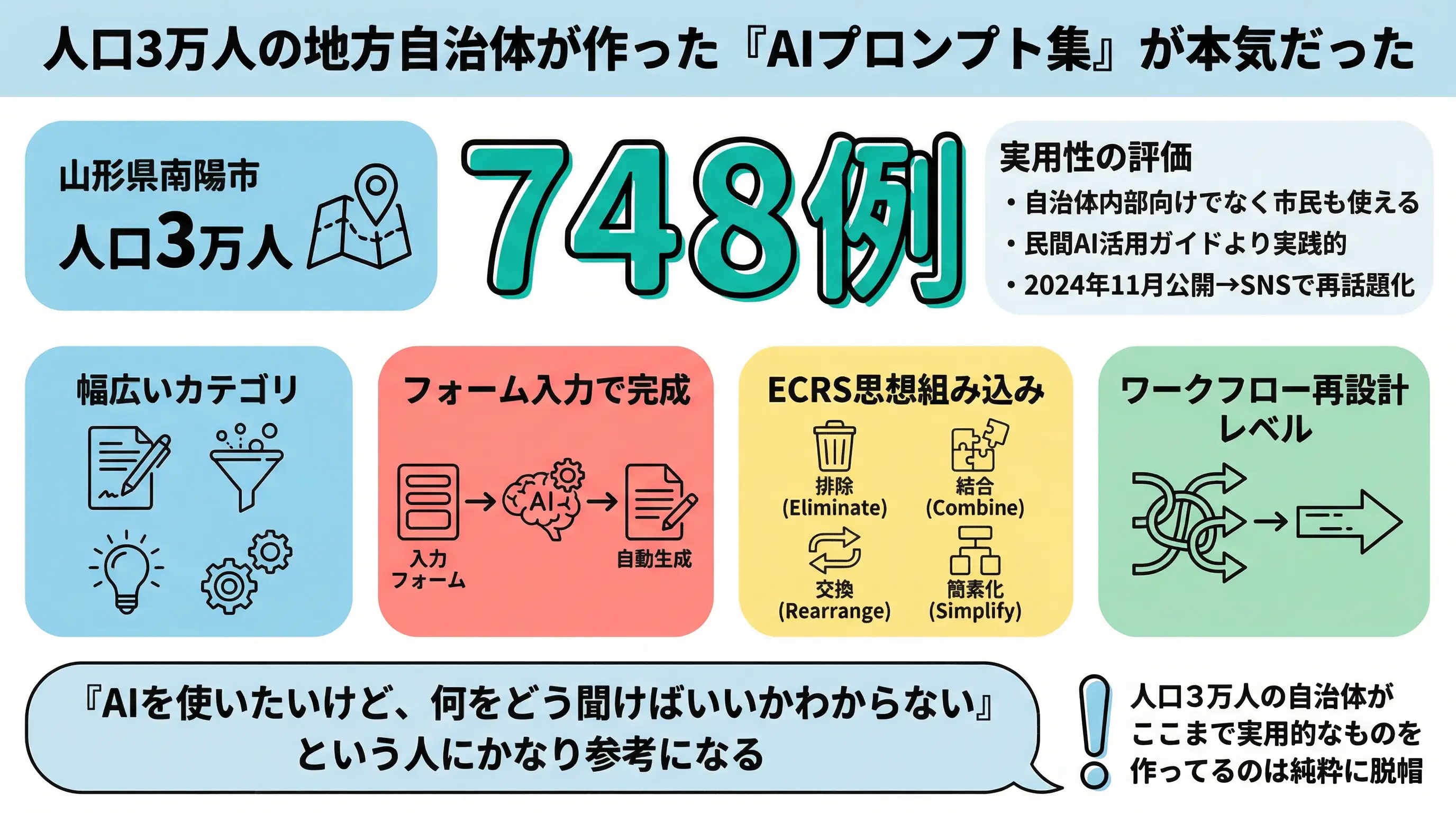 山形県の南陽市が、生成AIに使えるプロンプト(質問文のテンプレート)を748例まとめて無料公開しています。フォームに必要事項を入れるだけで、すぐに使えるプロンプトが作れる仕組みです。文章作成や要約、アイデア出しなど幅広い用途に対応しています。
