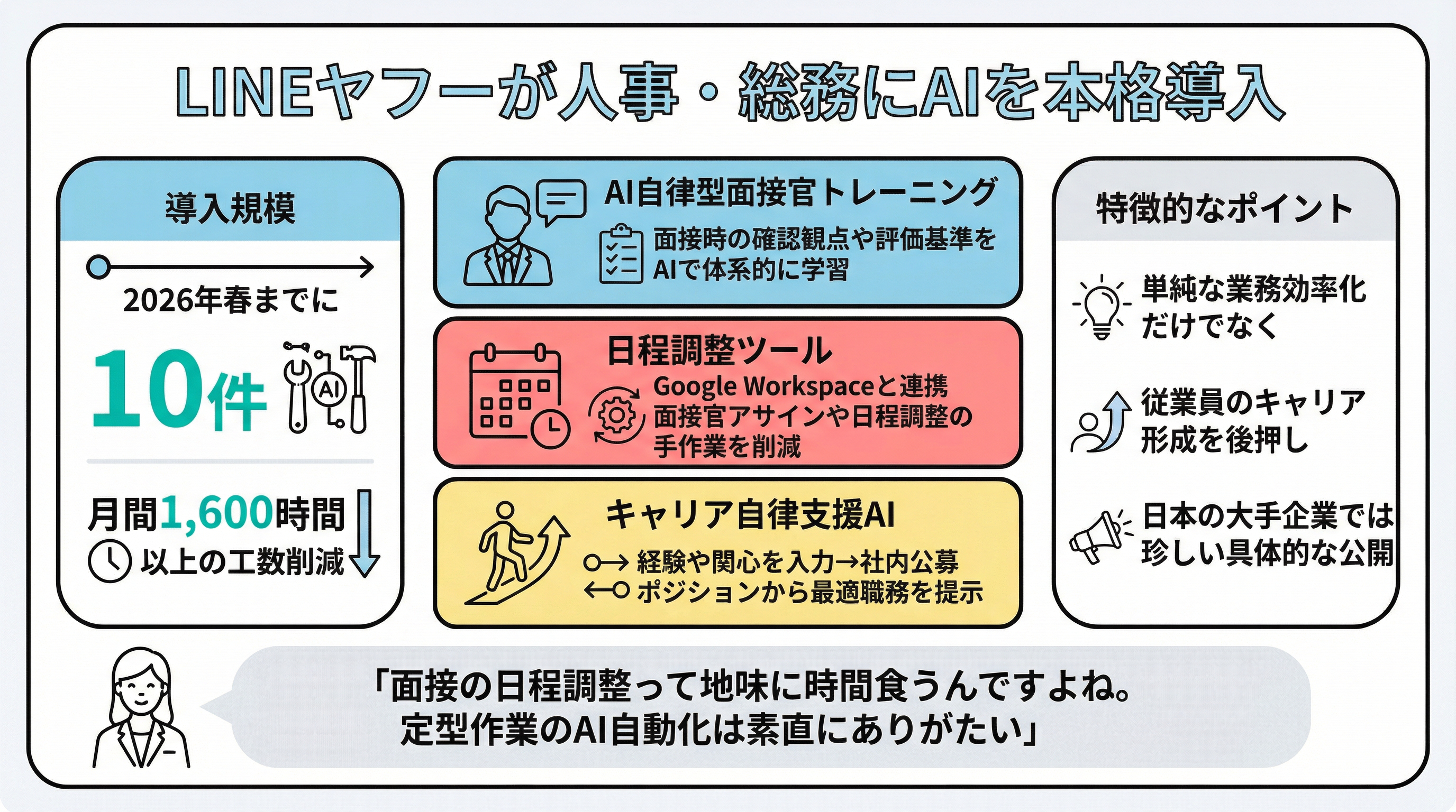LINEヤフーが人事・総務の業務に生成AIを本格導入します。2026年春までにAIツールを10件稼働させ、月間1,600時間以上の作業時間を減らす計画です。面接の日程調整の自動化や、社内での新しいポジション探しをAIが手助けしてくれる仕組みなど、具体的な活用例も公開されています。