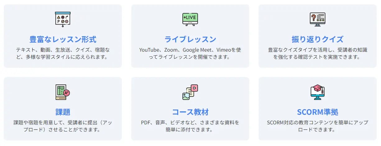 多様な講座形式: 動画、テキスト、ライブ配信など、あなたのスタイルに合わせて講座を作成できます。
