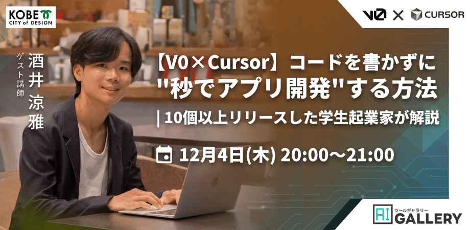 02 | ONLINE WORKSHOP 【V0 × Cursor】 コードを書かずに "秒でアプリ開発"する方法 ゲスト講師は、学生ながら10個以上のWebアプリをリリースし、アプリ甲子園2024ファイナリストにも選ばれた酒井涼雅さん! 「モックを作る」だけじゃなく、実際にユーザーに届けるところまでを実演付きで解説してもらいます。 | 会場 | オンライン(Google Meet) | | 参加費 | 無料 |
